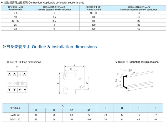 DZ47-100係列高分(fèn)斷小型斷路器適用於交流50Hz或(huò)60Hz,額定工作電壓為單(dān)相230V三相400V及(jí)以下,額定電流1~100A的照明配電(diàn)係統或電機配電係統線路的短路過(guò)載保護,具有隔(gé)離功能,適(shì)用(yòng)於建築行業分配電。同時也可在正常情況下不(bú)頻繁地通斷電器裝置(zhì)和照明線路。