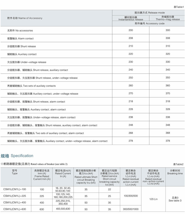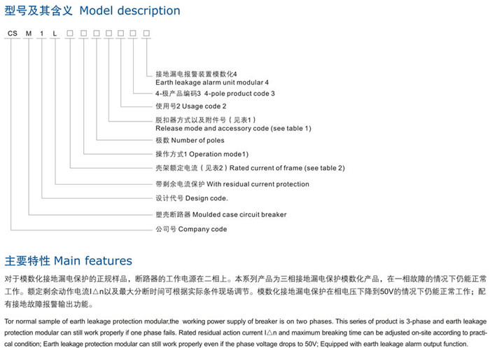 CSM1L(CM1L) 帶剩餘電流保護塑殼斷路器,額定絕(jué)緣電壓(yā)800V。適用於交流50Hz, 額定工作電壓400V,額定工作電流至630A的電路中作不頻(pín)繁轉換及電動機不頻繁起動(dòng)之用(yòng)。具有過載(zǎi)、短路和欠電壓保護功能,保護電路和電源設備不受損壞。能對過電流保護不能檢測出的由(yóu)接(jiē)地故(gù)障而可能引起的火災(zāi)危險提供保護。