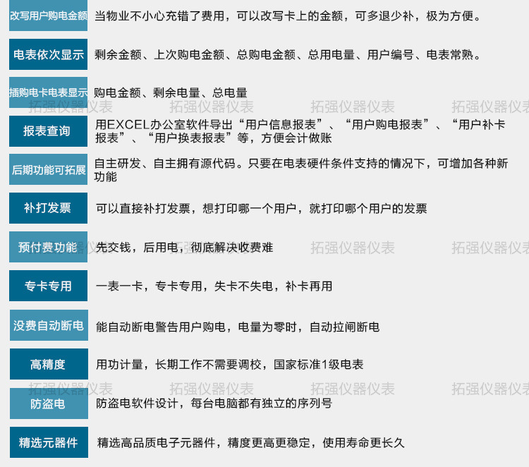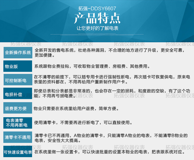 主要特點:應(yīng)用計算機管理,先(xiān)購電後用電;在額定電流範圍內能限製最大(dà)使用功率(由供電部門限定);一表一卡,專卡專用,失卡不失電,補卡再用;電卡能雙(shuāng)向(xiàng)傳遞(dì)數據,能自動斷電告警用戶購電;電量為零時,自動拉閘(zhá)斷電;並具有一定的防竊電軟件設計等。
