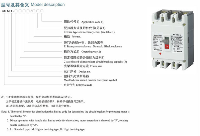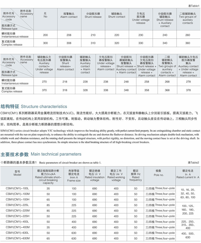CSM1(CM1) 係列斷(duàn)路器主要用(yòng)於交流50Hz,額定(dìng)電壓690V、400V及以下,額定電流630A及(jí)以下(xià)的配電網絡中作為分配電能和(hé)保護線路及(jí)電(diàn)源設備的過(guò)載、欠(qiàn)電壓和短路,殼架(jià)等級額定(dìng)電流400A及(jí)以(yǐ)下的斷路器也可作為電動機的過載、欠電壓和(hé)短路(lù)保護。具有隔離功能,適用於(yú)建築(zhù)行業分配電。在正常條件下可作為線路的(de)不頻繁轉換和(hé)電動機的不頻(pín)繁起動之(zhī)用。