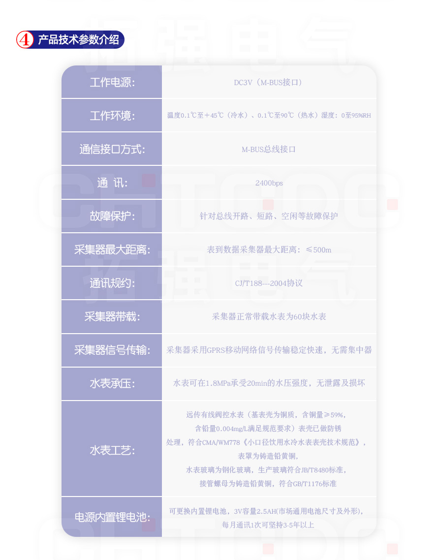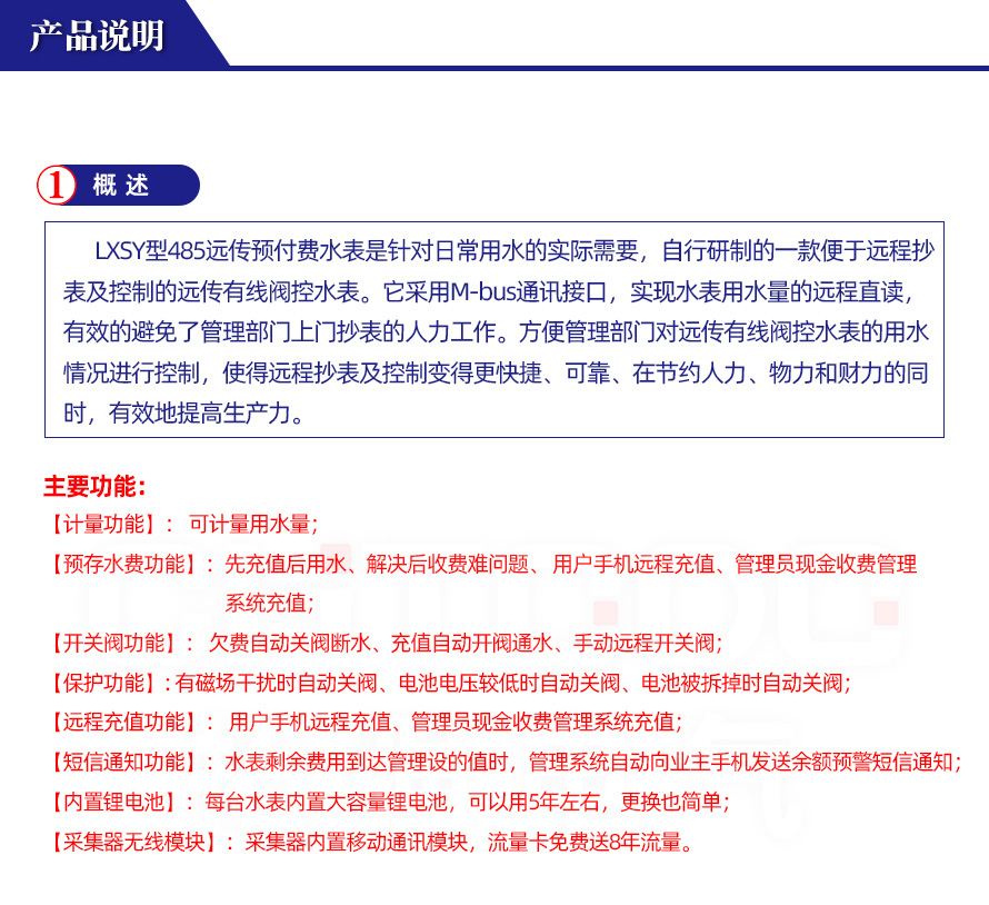 -遠傳水表采用絕對編碼方(fāng)式和M-BUS通訊方式,信號傳輸穩(wěn)定,無需外接電源(yuán)通讀時需要的電流直(zhí)接由(yóu)M-BUS總線提供,抄表方(fāng)式快捷,數(shù)據更準確、可靠(kào)。