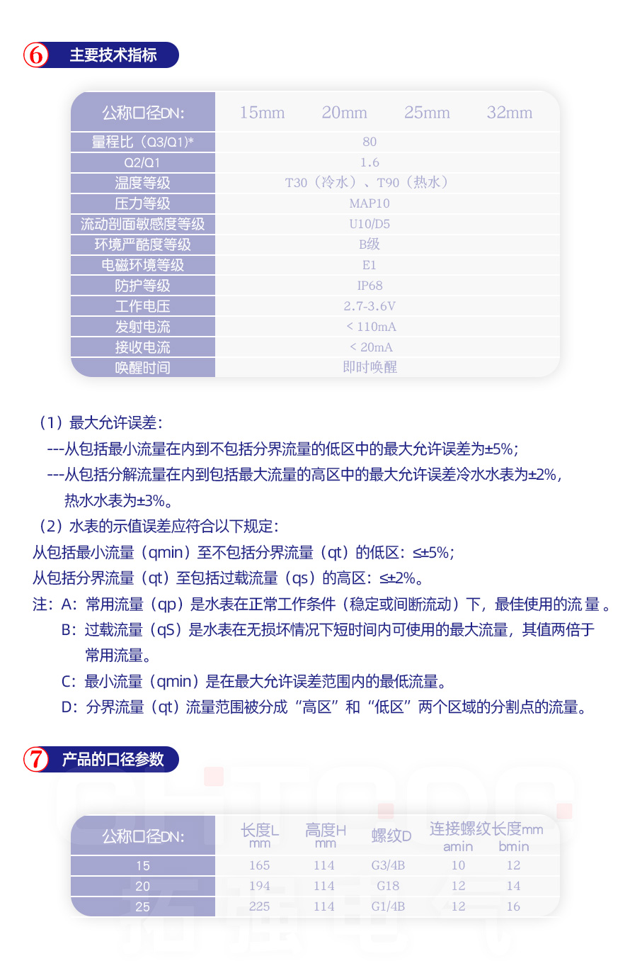 ---從包括分解流量在內到包(bāo)括最大流量的高(gāo)區中的最大允許誤差冷水水表為±2%,熱水水表為±3%。