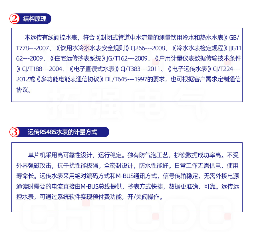 本遠傳有線閥控水表,符合《封閉式管道中(zhōng)水流量(liàng)的測量 飲用冷水和熱水水表》GB/T778---2007、《飲用水(shuǐ)冷水水表(biǎo)安全規則》CJ266---2008、《冷水水表檢定規程》JJG1162---2009、《住宅遠傳抄表係統》JG/T162---2009、《戶(hù)用計量儀表數據傳輸技術條件(jiàn)》CJ/T188---2004、《電子直讀式水(shuǐ)表》CJ/T383---2011、《電子(zǐ)遠(yuǎn)傳水表》CJ/T224---2012或《多功能電能表通信協議》DL/T645---1997的要求,也可(kě)根據(jù)客戶需求(qiú)定製通信(xìn)協議。
